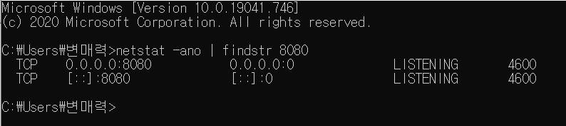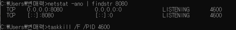 2. 필자의 경우 충돌하는 포트번호가 8080이다. cmd창에서 'netstat -ano | findstr 8080' 를 입력해서 실행중인 프로세스 PID를 확인한다.