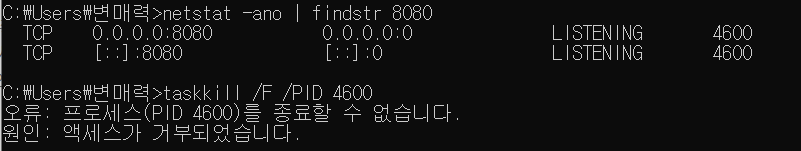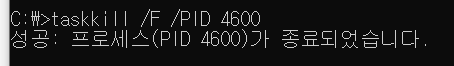 3. PID를 확인 후 'taskkill /F /PID포트번호'를 입력해서 해당 프로세스를 중지시킨다.