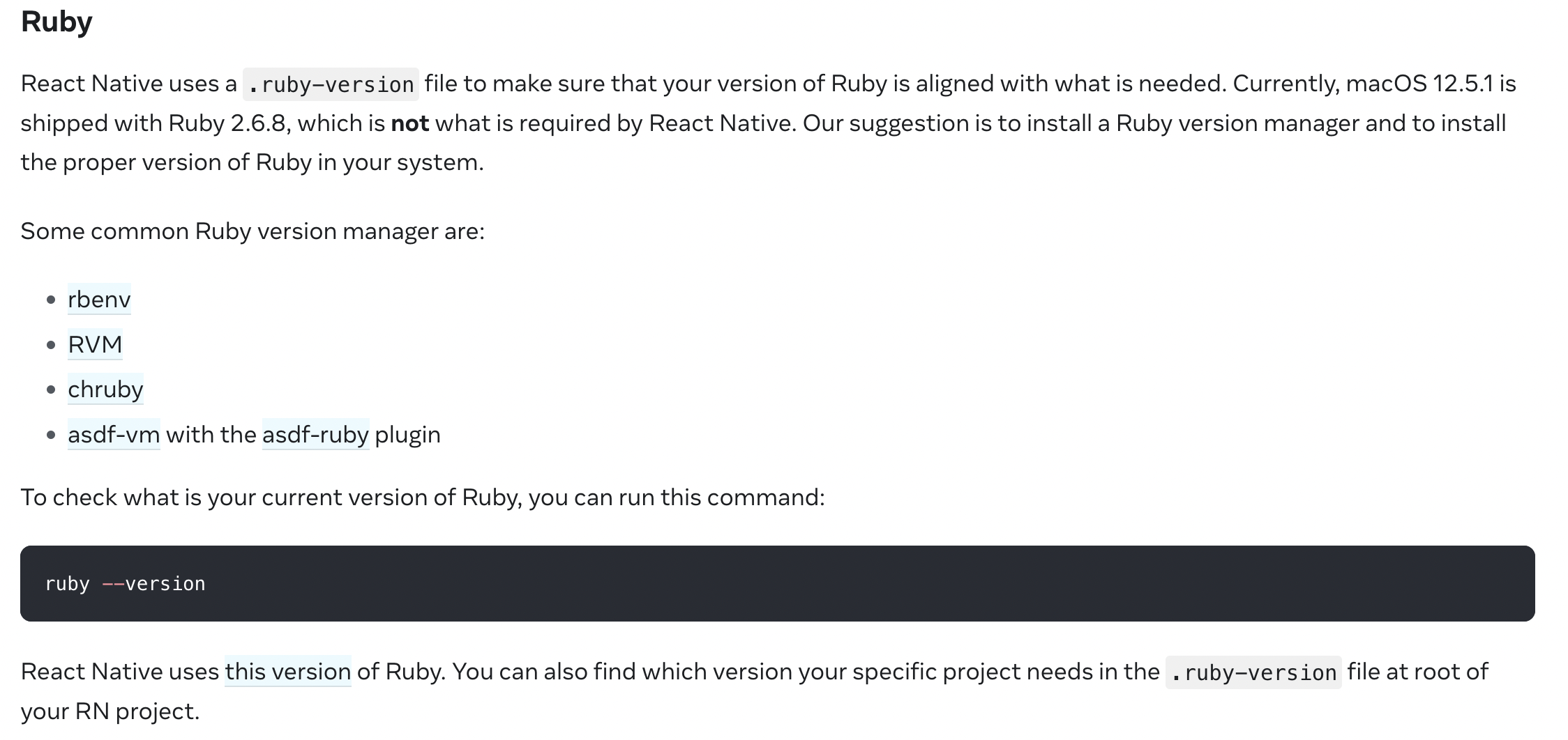 리액트 네이티브 홈페이지의 환경설정 부분을 살펴보면 0.70 버전부터 ruby버전을 맞춰줘야한다. 0.70 버전에는 ruby 2.7.5 이상이 설치되어 있어야하지만 2.6.8이라 오류가 발생했다.
