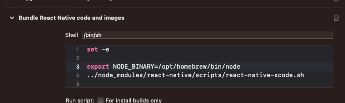Target -> Build Phases -> Bundle React Native code and images에서 NODE_BINARY 경로를 확인하면 node로 잡혀있다.